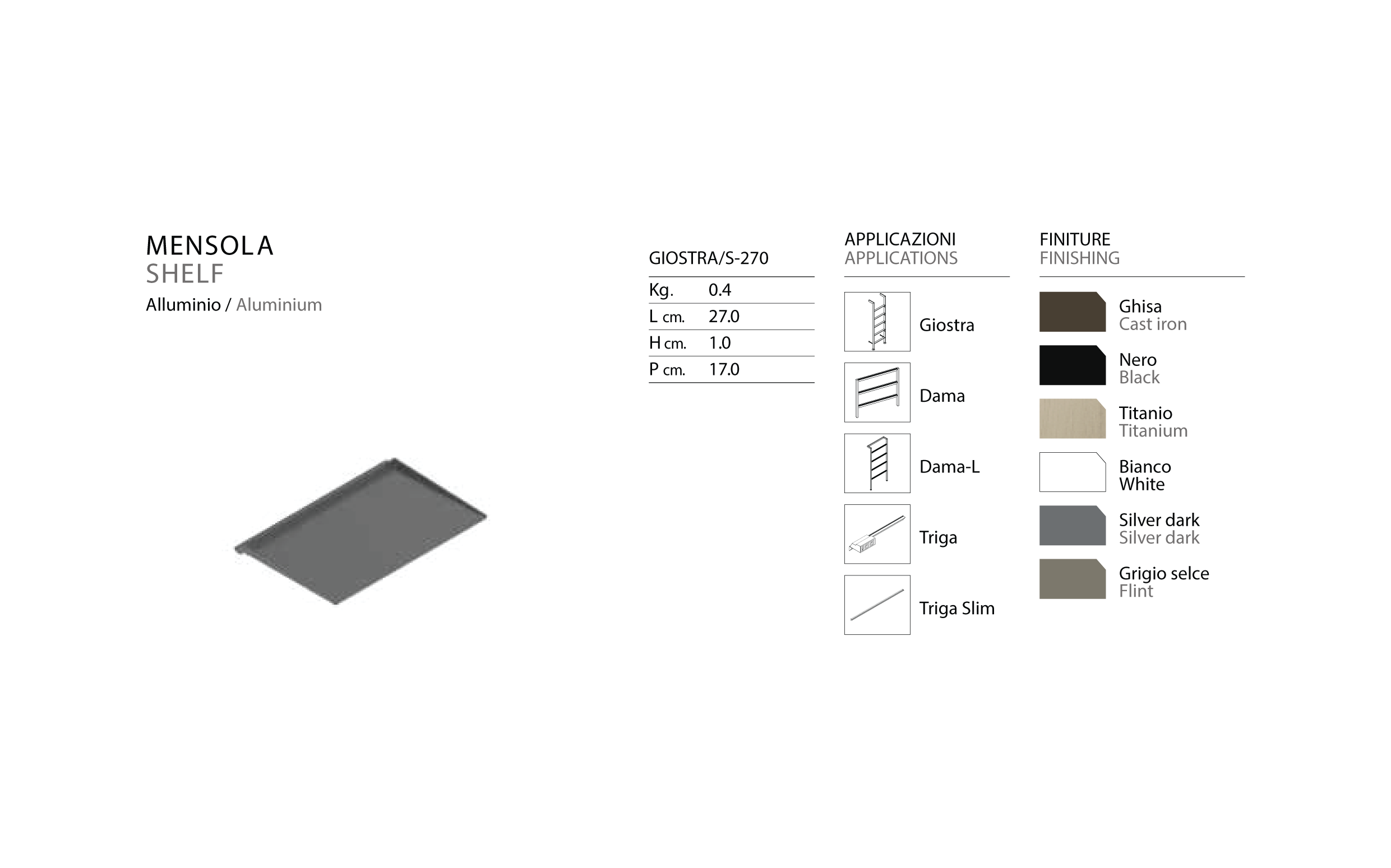 Especially designed to service collections of the product range of Damiano Latini. They aid the functionality of every interior system and create an original appearance, improving every space they're placed in. Shelf A is an aliminium shelving plane, used for different types of kitchen and everyday objects. They are long enough to allow the hanging of more than one element. . Damiano Latini has established itself as one of the flagship actors in the current Italian Design scene. Their automonomously designed products are being drawn and tested by architects,engineers and designers in the main maufacturing warehouse in the centre of Italy. The company is a winner of many European Interior Design Prizes such as Reddot Design and Archiproduct awards.