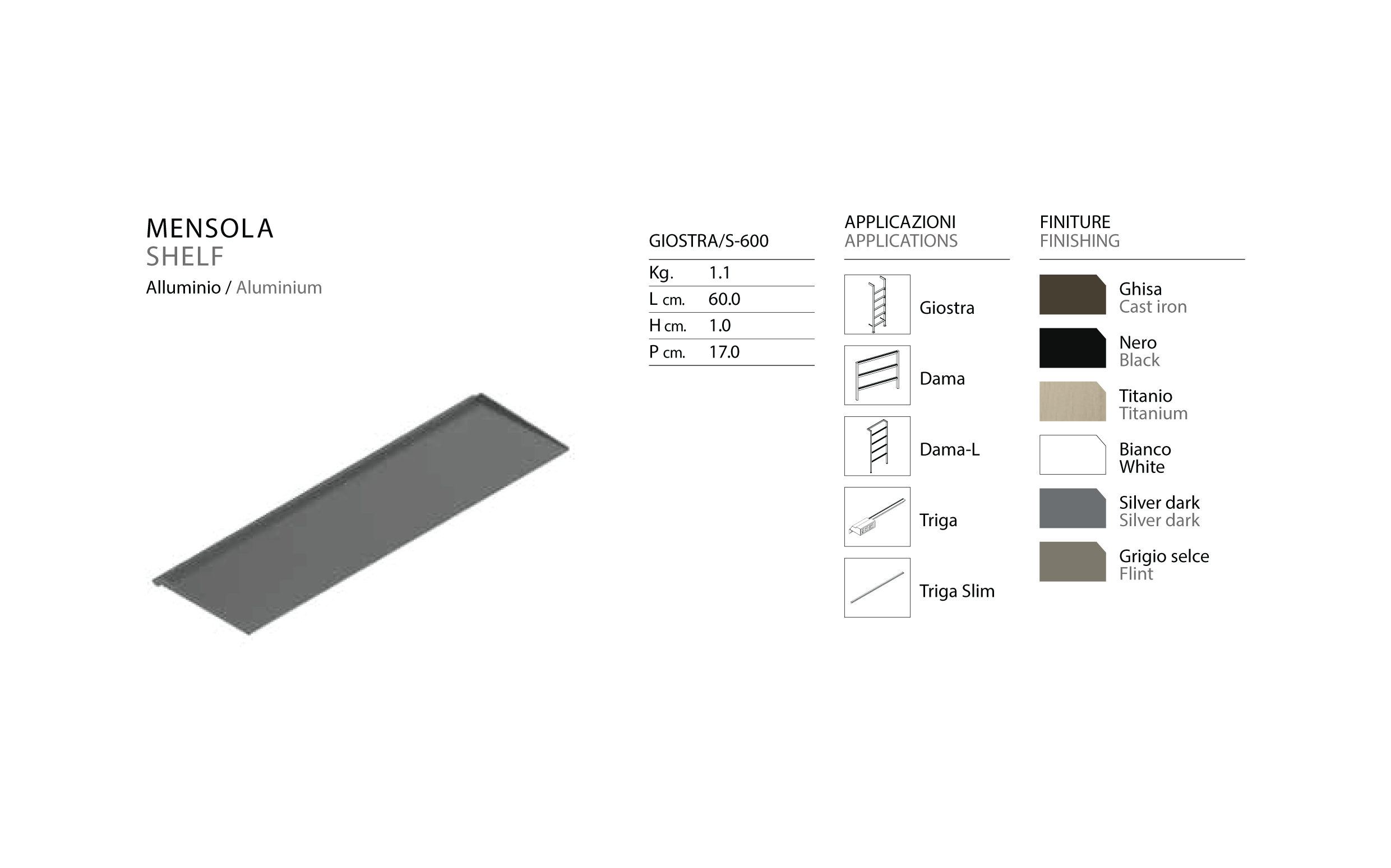Especially designed to service collections of the product range of Damiano Latini. They aid the functionality of every interior system and create an original appearance, improving every space they're placed in. Shelf C is an aliminium shelving plane, used for different types of kitchen and everyday objects. They are long enough to allow the hanging of more than one element. . Damiano Latini has established itself as one of the flagship actors in the current Italian Design scene. Their automonomously designed products are being drawn and tested by architects,engineers and designers in the main maufacturing warehouse in the centre of Italy. The company is a winner of many European Interior Design Prizes such as Reddot Design and Archiproduct awards.