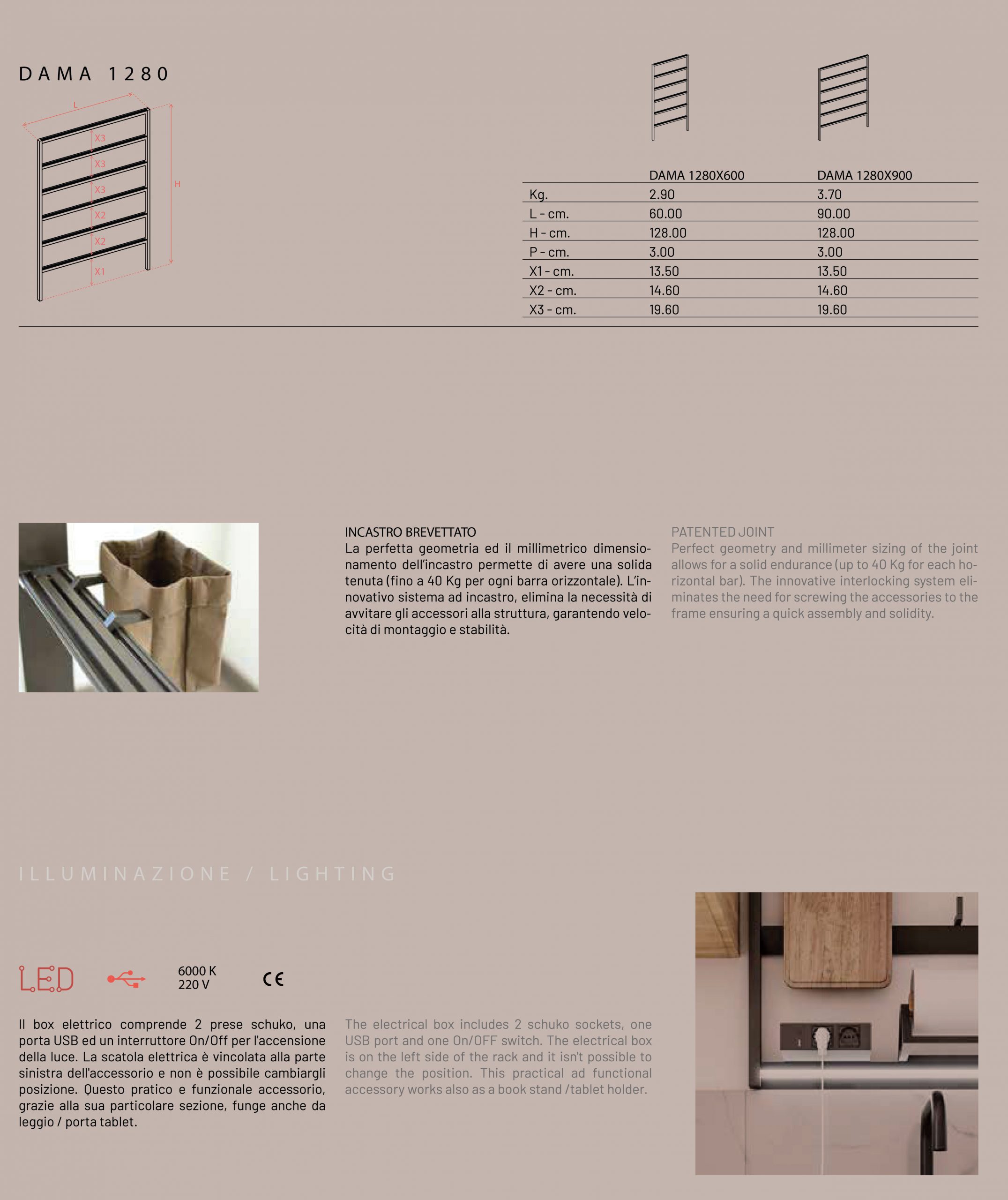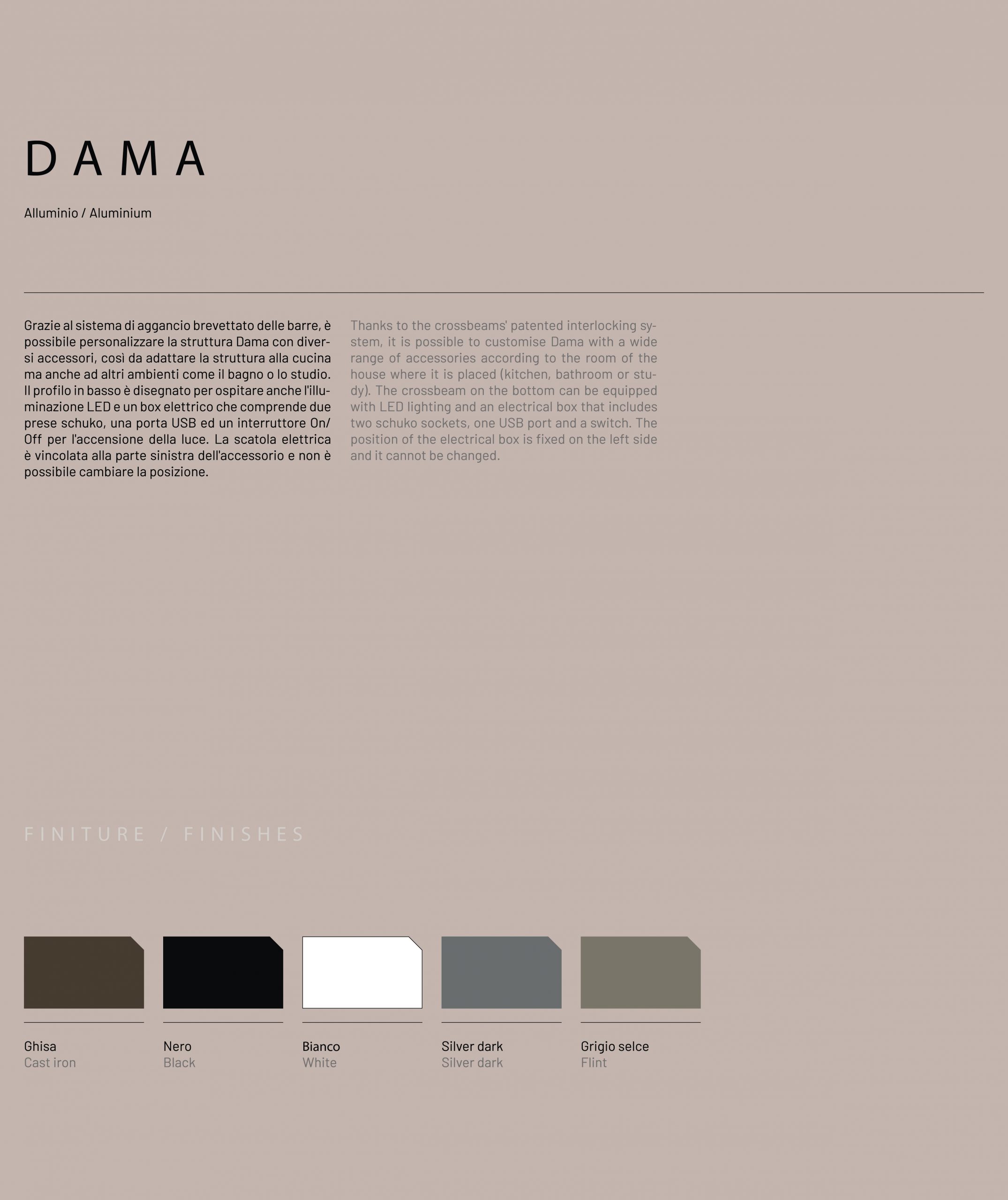 Системата Dama, проектирана и разработена от Damiano Latini, илюстрира един по-различен нов прочит на стенната лавица, като тривиална и остаряла практика.Елементът дава възможност да бъде използван самостойно,както и композиционно,чрез финален резултат,представен от няколко елемента.Предимството на този продукт, е че е плод на работата на архитекти,инженери и дизайнери, не на последно място - произведен е в Италия. Различни видове аксесоари са проектирани специално за системата. Те се различават по форма и размер, но това което е по-важно, е че те приобщават много различни предмети , показвайки финалната визия на елемента, като наистина мултифункционален.