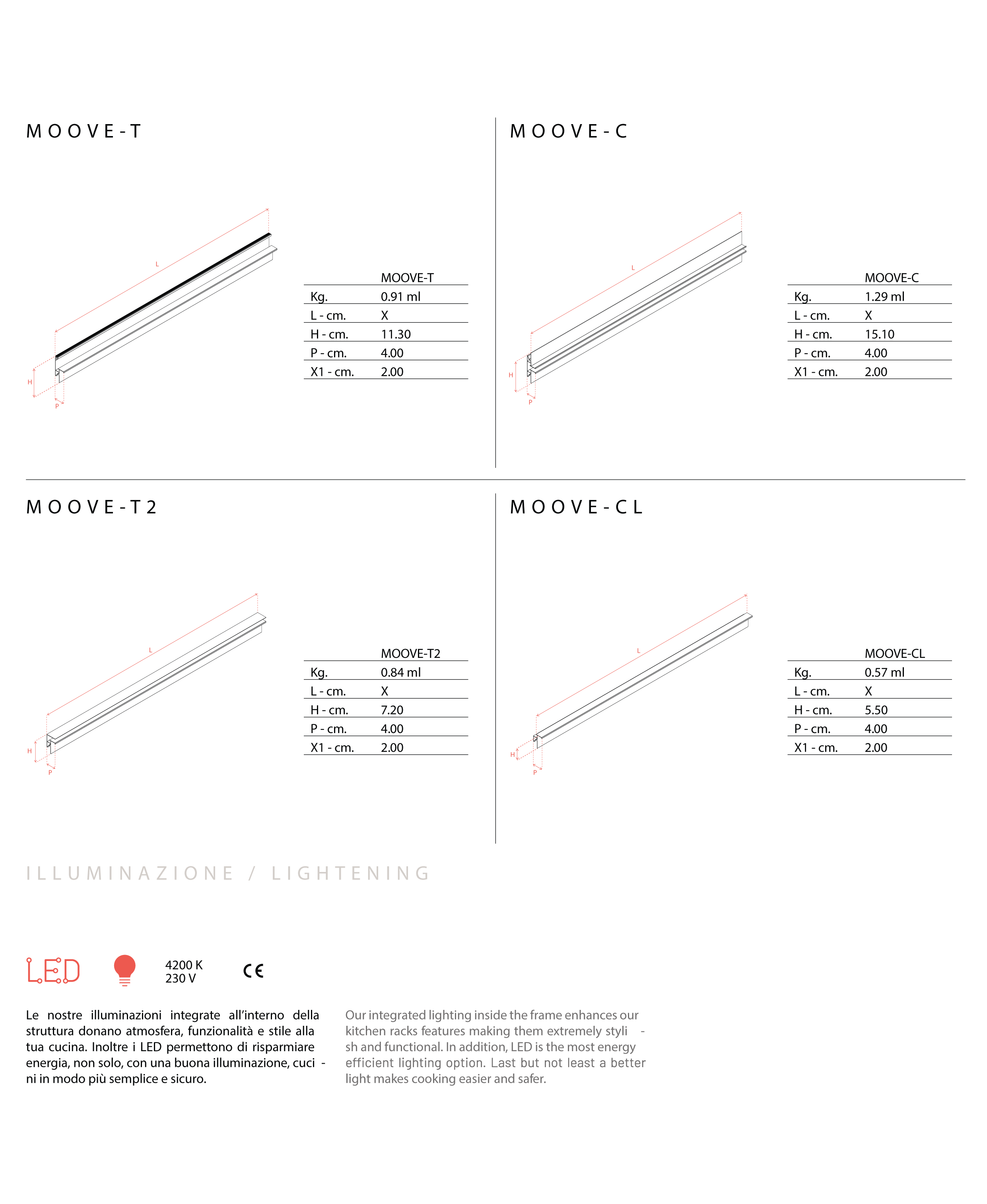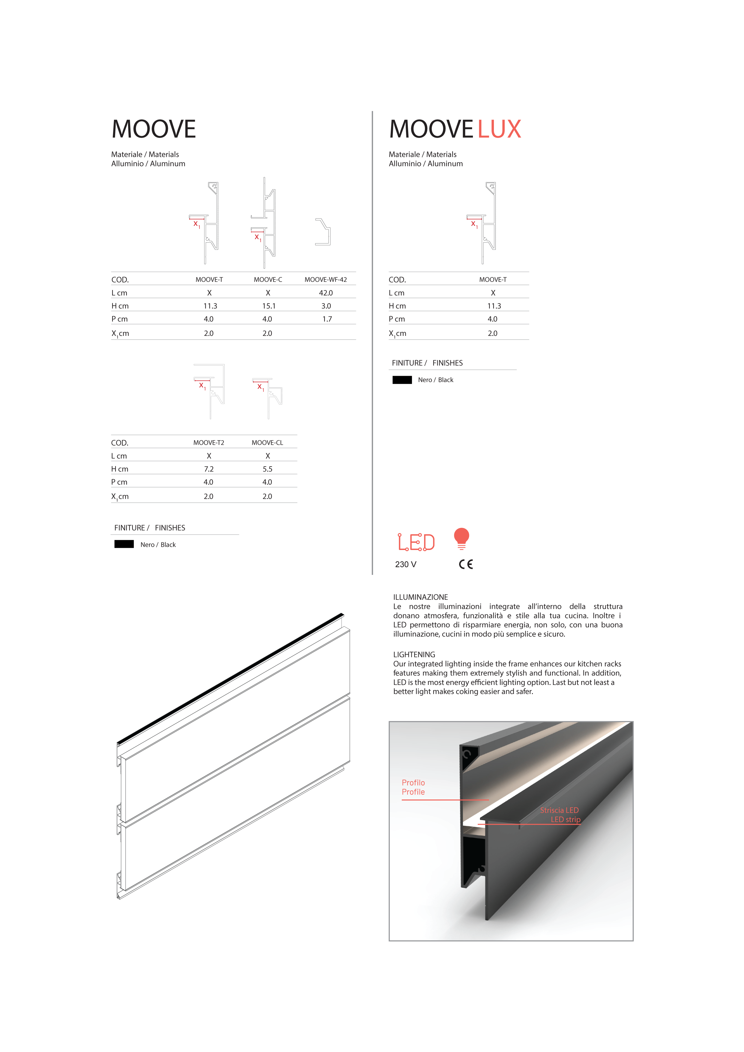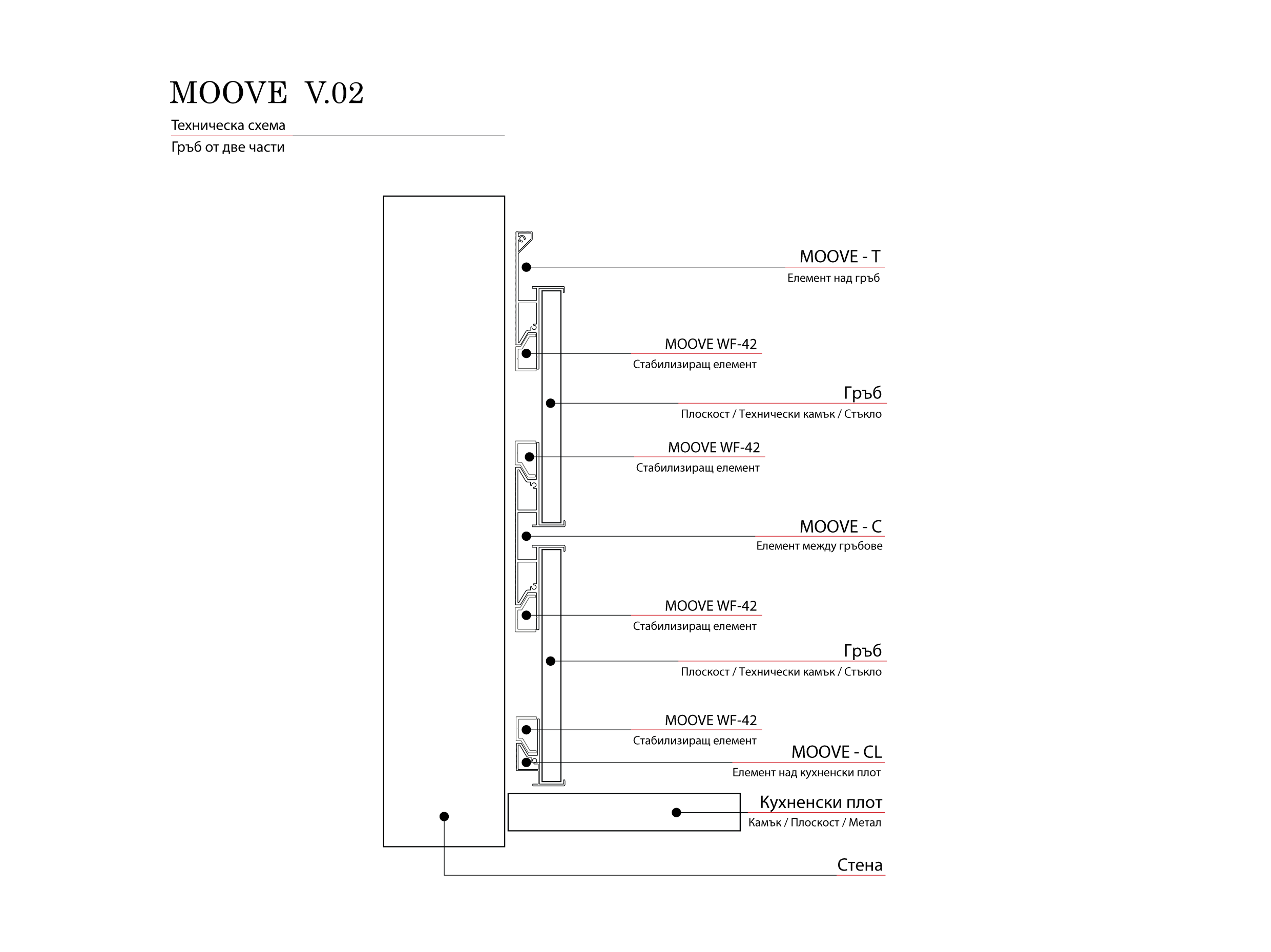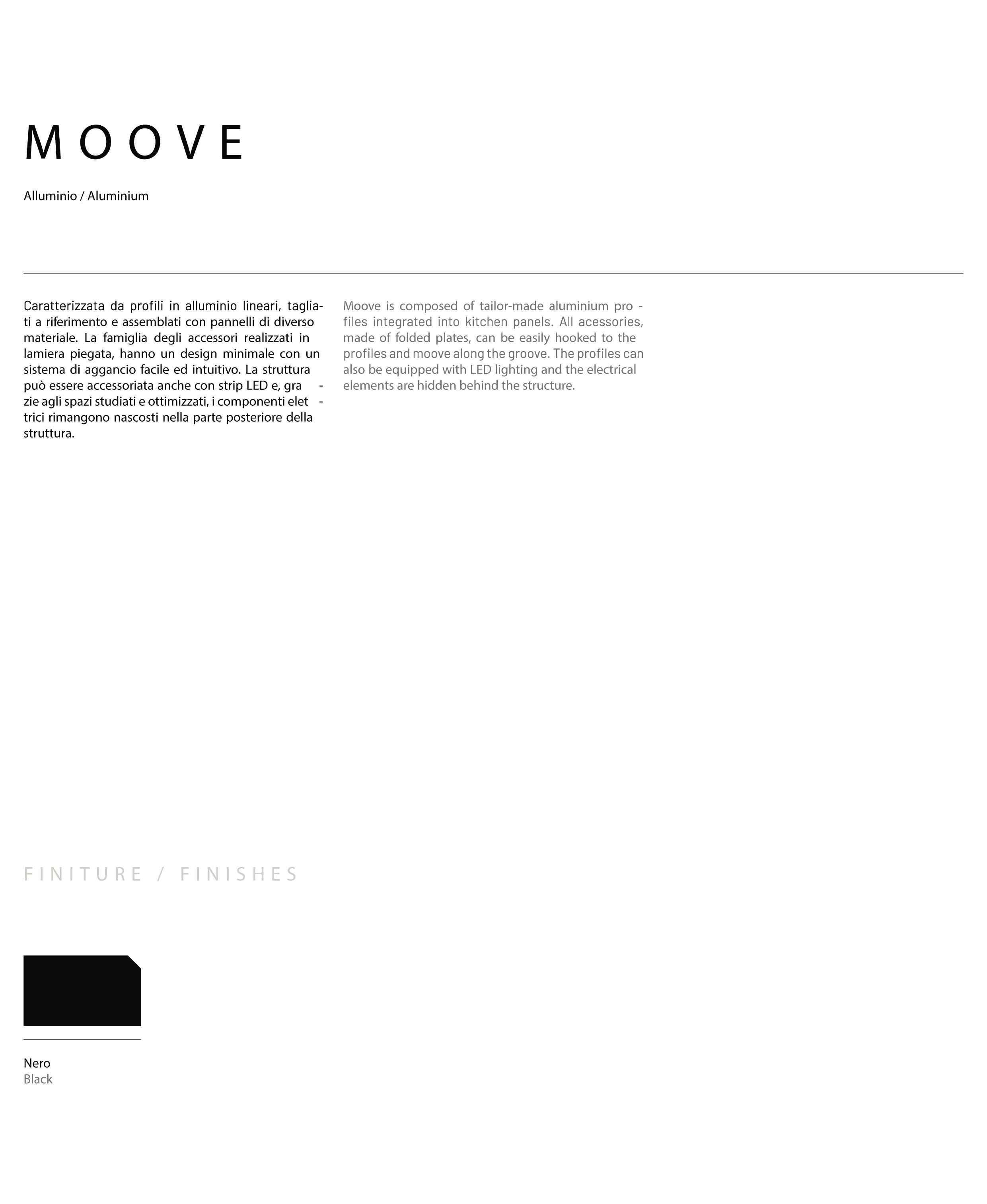 Moove е проектирана да разгледа кухненската ламперия под изцяло нов прочит.Съставена е от три основни интегрирани алуминиеви профила,които са персонализирани с разнородни кухненски аксесоари и LED осветление.Moove е адаптивно решение,защото може да бъде инсталирана на всякакъв вид кухнески гръб, следователно ползвателя и мебелиста не са ограничени при избирането на материал. Многофункционалните профили действат,като кухненски закачалки, за аксесоарите изработени специално за продукта, където е възможно закачването на различни инструменти . Може да изберете да интегрирате LED лента в горният профил, за да осветите кухненският гръб и/или лентата в долният профил Ви позволява да осветите работният плот. Продуктът е произведен,без определена дължина,така че да удовлетвори дори и на най-специфичното пространство.